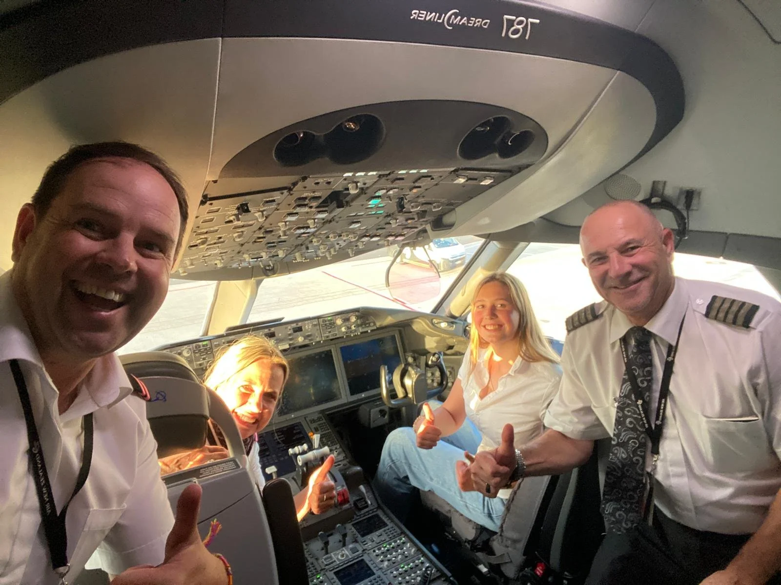 In the dreamliner jumpseat for a day - a prize won at Walsh Flying Camp. Here she is (in the First Officer’s seat) with Captain Warren Mendoza, First Officer Penny Armstrong and Second Officer Wayne Theobald